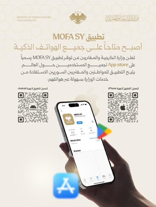 أطلقت وزارة الخارجية والمغتربين السورية تطبيقها الرسمي “MOFA SY” على متجر App Store، في خطوة رقمية متقدمة تهدف إلى تحسين الخدمات القنصلية وتسهيل التواصل مع المواطنين في الداخل والمغتربين في الخارج.