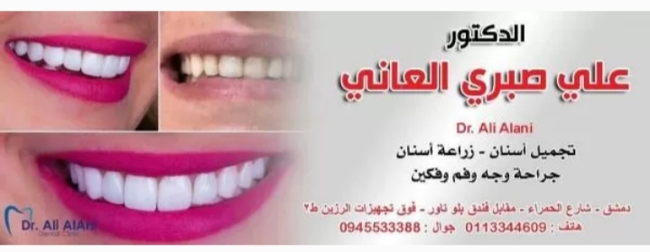 “الدكتور علي صبري العاني” * الاختصاص: تجميل أسنان، زراعة أسنان، جراحة وجه وفم وفكين هاتف: 0113344609_ 0945533388 العنوان: دمشق، شارع الحمرا، مقابل فندق بلو تاور، فوق تجهيزات الزين ط 2...