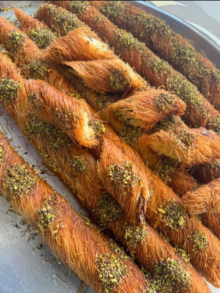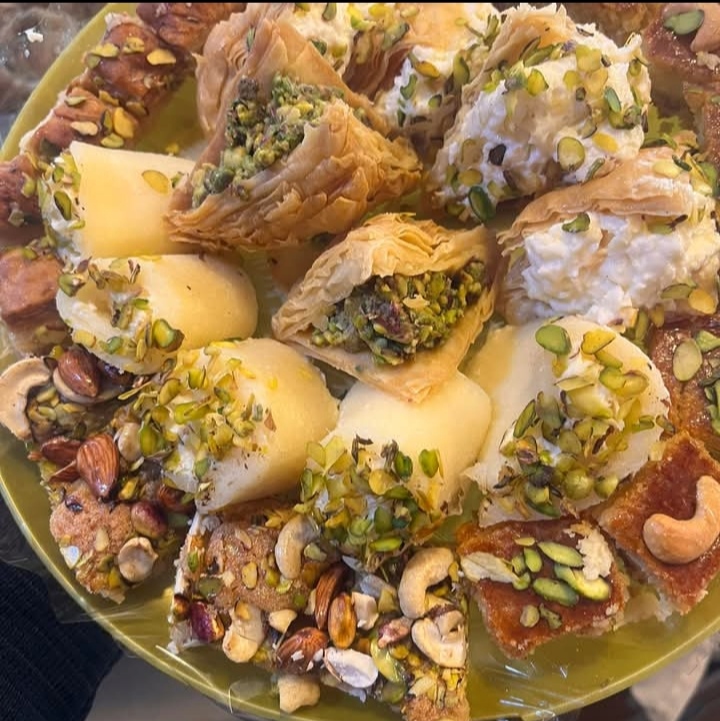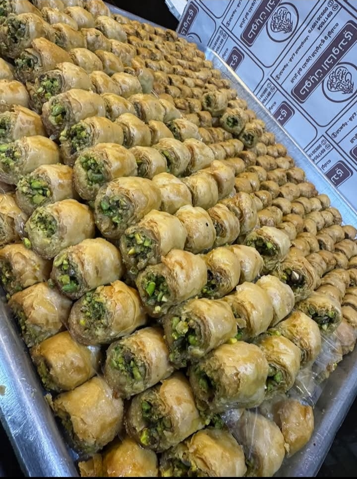 _لوتس _ مدلوقة _ عصملية _ نابلسية _ ستاتي ( بالقشطة، وبالجوز) _ نهش _ كول وشكور _ تاج الملك _ بقلاوة _ عوامة _ مشبك _ أصابع _ شرحات بالفستق الحلبي