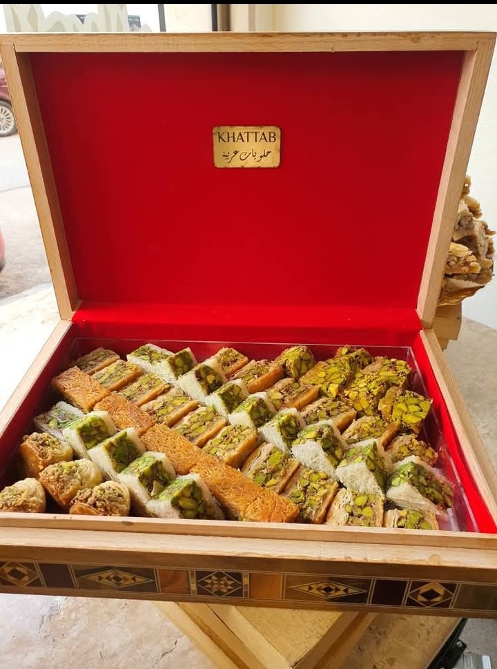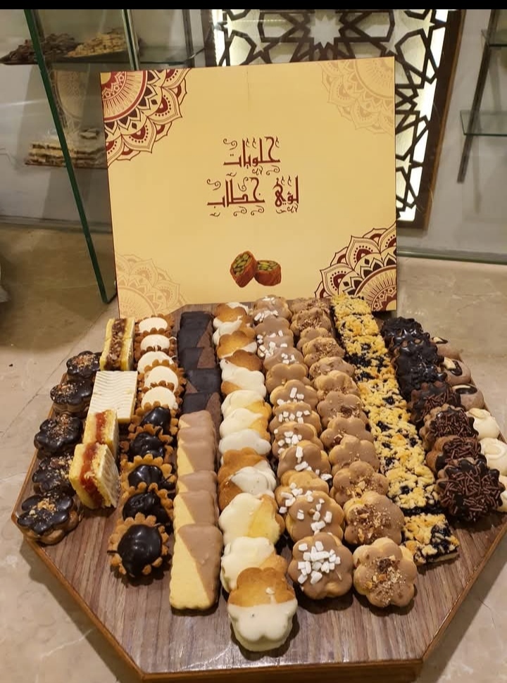 _ معمول بالجبن بالسمن العربي _ قوالب كيك فاخرة _ تاج الملك بالفستق الحلبي _ تمرية بالمكسرات ( لقمة من الفخامة والطاقة) _ ملوكي بالفستق الحلبي _ بقلاوة ( بالفستق ، والجوز الحبة البلدية الاكسترا) _ بتفور محشي بالبستاشيو وكريم البندق والكيت كات والرفايللو