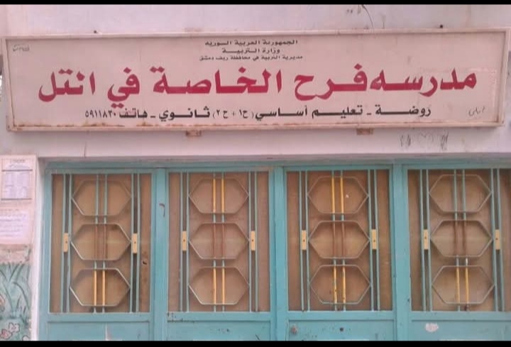 “مدرسة فرح الخاصة” _ روضة_ تعليم أساسي (ح1+ ح2)_ ثانوي هاتف: 0115911830_ 0932210330 العنوان: ريف دمشق، التل، حرنة الشرقية، مقابل حديقة علاء الدين