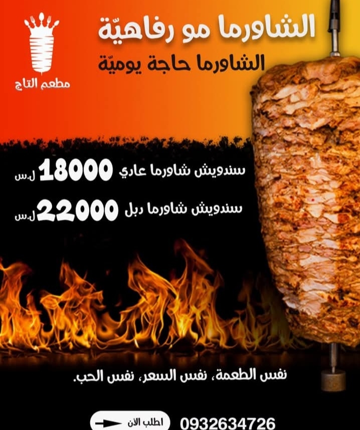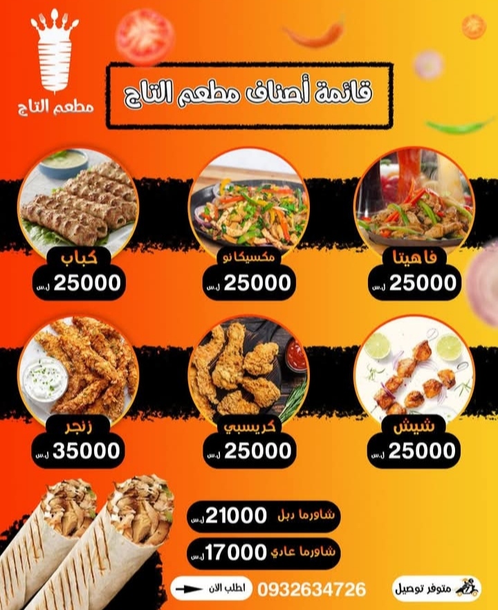 ★ يقدم مطعم التاج: سندويش ووجبات شاورما _ فاهيتا _ مكسيكانو _ كباب _ شيش _ كريسبي _ زنجر…★