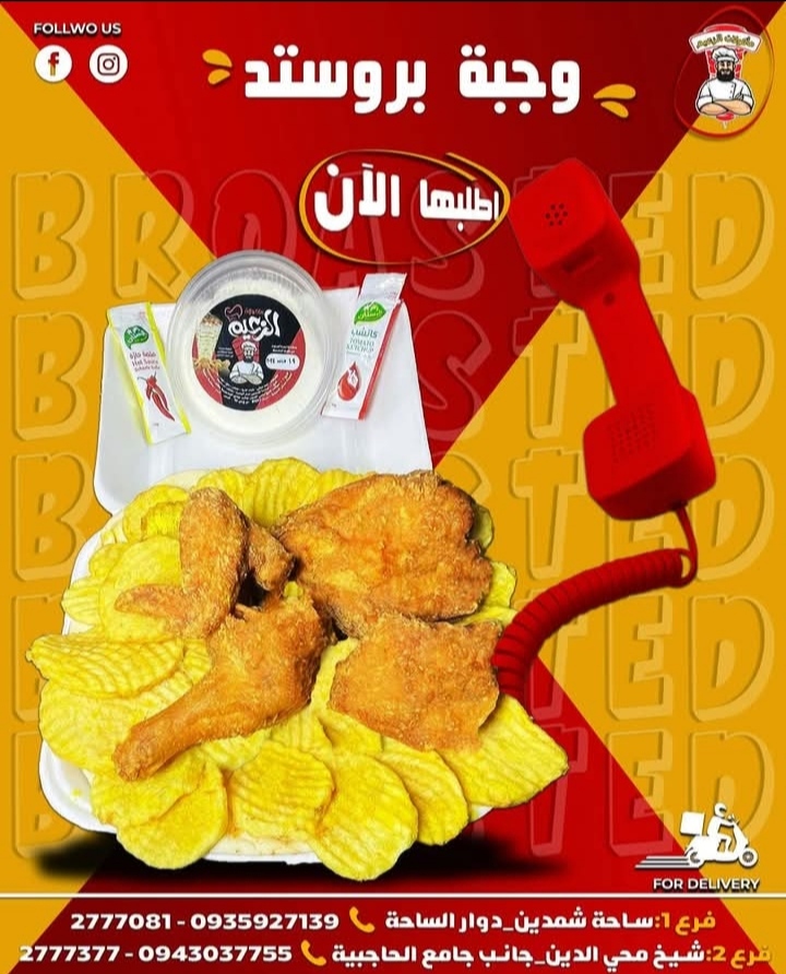 ★ يقدم المطعم: شاورما _ فروج بروستد، فروج مشوي _ سندويش _ وجبات غربية ( وجبة الزعيم، وجبة ماغنوم، وجبة جوليان، وجبة زنجر، وجبة كريسبي، وجبة اسكالوب، وجبة كرانشي، وجبة ماليبو، وجبة بلانيت، وجبة كوردون بلو، وجبة سوبريم، وجبة فرانسيسكو، وجبة فاهيتا، وجبة شيش، وجبة مكسيكي)