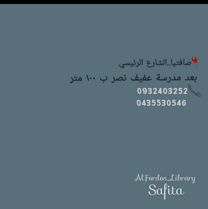 “مكتبة الفردوس” * قرطاسية مدارس، لوازم خياطة واكسسوارات ، كل ما يخص الهاند ميد هاتف: 0932403252 العنوان: صافيتا، الشارع الرئيسي ، دخلة محلات دربو، بعد مدرسة عفيف نصر ب 100متر...