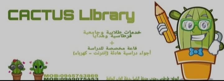 ** أهلا بكم في مكتبة Cactus Library التي تقدم لكم كافة الخدمات الطلابية والجامعية وتشكيلة واسعة من القرطاسية، والهدايا المميزة ، بالإضافة إلى تخصيص قاعة للدراسة مع توفر أجواء دراسية هادئة مع وجود انترنت وكهرباء **